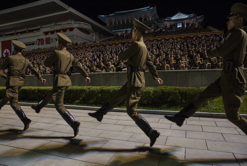 Binh lính Triều Tiên bước đều trong lễ diễu binh kỷ niệm 70 năm ngày quốc khánh Triều Tiên. |