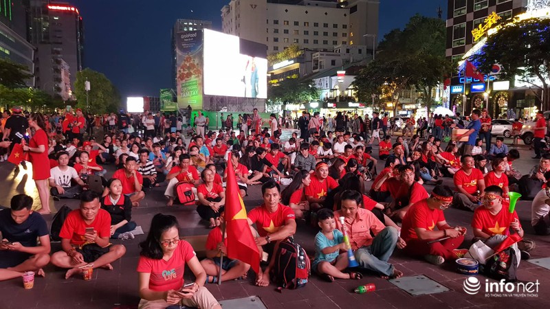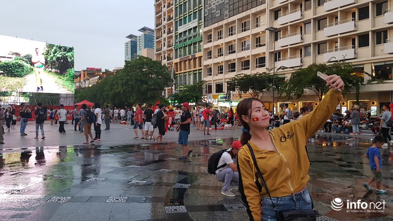 Trận đấu còn hơn 1h đồng hồ nữa mới diễn ra nhưng phố đi bộ Nguyễn Huệ đã đông đúc, rực màu đỏ của người hâm mộ |