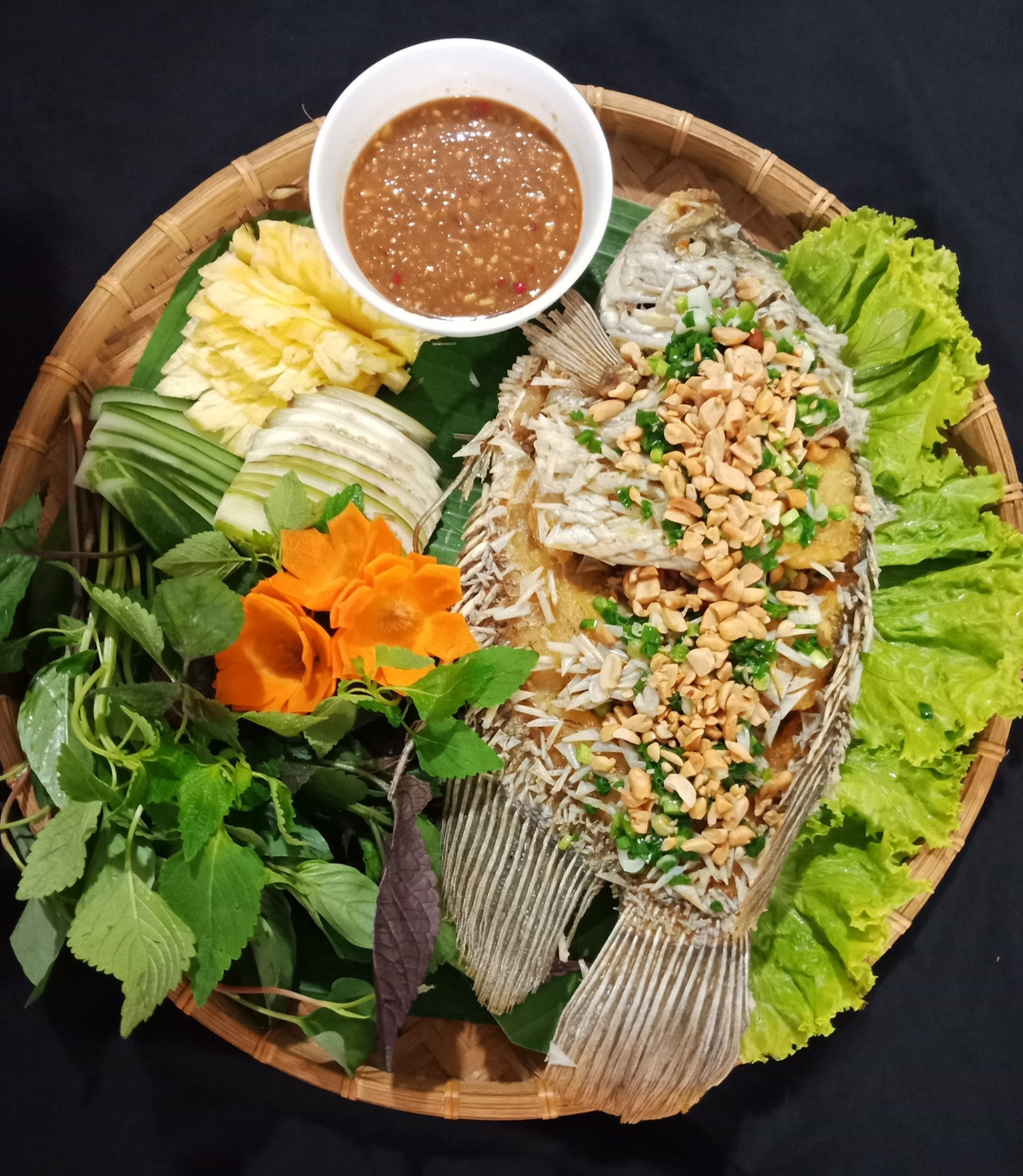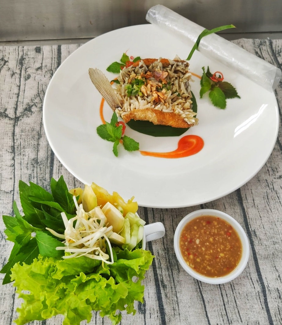 Cá tai tượng chiên xù thường được cuốn cùng với bánh tráng, rau sống, bún và chấm nước chấm chua cay (Ảnh: Cuong Manh Dao, Hồ Quốc Kiệt)
