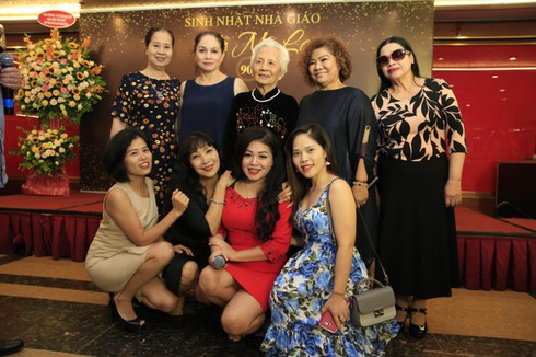 Các thế hệ học trò quây quần trong ngày mừng thọ tuổi 90 của bà giáo Hồ Mộ La. |