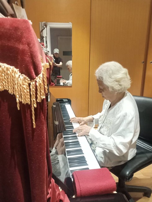 Dù mắt đã mờ nhưng bà giáo Hồ Mộ La vẫn có thể tự tay đệm đàn cho học trò luyện thanh. |