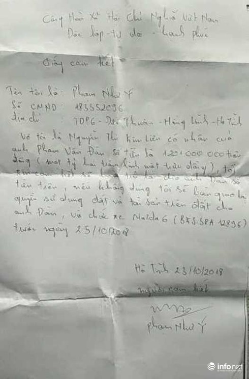 Ở một diễn biến khác, ngày 23/10/2018, anh Phạm Như Ý, cũng ký xác nhận việc vợ mình nhận của ông Phạm Văn Đàn số tiền trên 1,2 tỷ đồng. Trong giấy cam kết, anh Ý viết: “Vợ tôi là Nguyễn Thị Kim Liên có nhận của anh Phạm Văn Đàn số tiền là 1.201.000.000 đồng (một tỷ hai trăm linh một triệu đồng), tôi xin cam kết sẽ hoàn trả lại cho anh Đàn số tiền trên, nếu không đúng tôi sẽ bàn giao lại quyền sử dụng đất và tài sản trên đất cho anh Đàn, và chiếc xe Mazda 6 (BKS 38A-128.96) trước ngày 25/10/2018”.