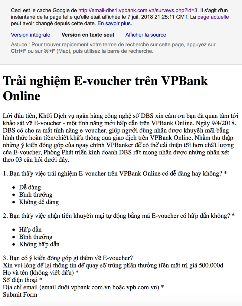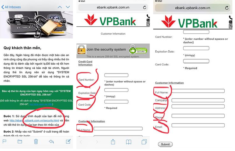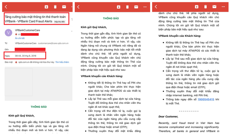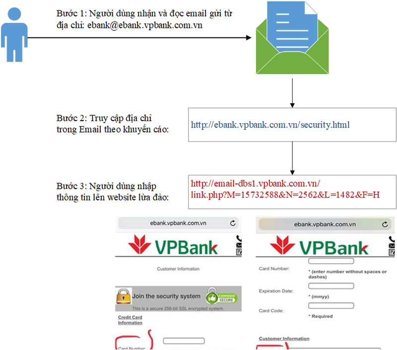 Các đối tượng lừa đảo gửi email cho các khách hàng của VPBbank dưới dạng thông báo của VPBank cho biết đã nhận được một báo cáo an ninh công nghệ địa phương và thấy rằng nhiều thẻ tín dụng đã bị đánh cắp bởi người lạ. Đồng thời, yêu cầu khách hàng có thẻ tín dụng sử dụng dịch vụ "SYSTEM ENCRYPTED SSL 256-bit" để bảo vệ thông tin cá nhân tốt hơn. Email còn hướng dẫn cụ thể đường link để sử dụng dịch vụ nói trên.