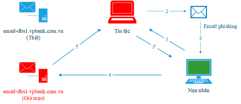 Bước 4: Thay vì người dùng truy cập địa chỉ máy chủ email-dbs1.vpbank.com.vn thật, Hacker chuyển hướng toàn bộ yêu cầu của người dùng đến máy chủ email-dbs1.vpbank.com.vn giả mạo.