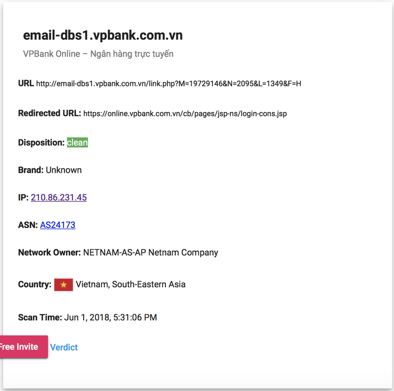 Bước 3: Khi người dùng mở email và click và đường link, domain email-dbs1.vpbank.com.vn bị mã độc trong mạng nội bộ giả mạo.
