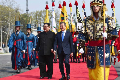 Tổng thống Hàn Quốc Moon Jae-in và nhà lãnh đạo Triều Tiên Kim Jong-un tham dự lễ đón tiếp long trọng hôm 27/4 tại vùng phi quân sự. |