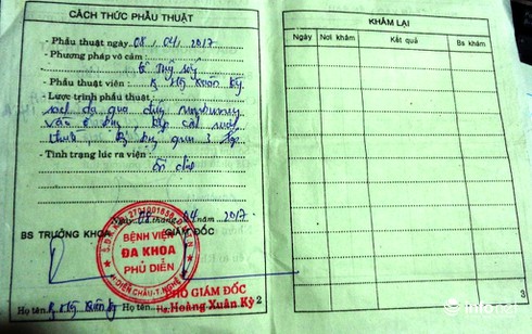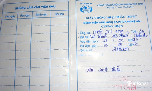 Tại Giấy chứng nhận phẩu thuật ngày 8/4/2017 của bệnh nhân do Bác sĩ Hoàng Xuân Kỳ - Phó Giám đốc BVĐK Phủ Diễn ký xác nhận (bác sĩ Kỳ cũng là người trực tiếp phẩu thuật cho chị Hoa) cho thấy, bệnh nhân Hoa được tê tủy sống, rạch da qua đường Macburney vào ổ bụng, kẹp cắt ruột thừa, đứng bụng qua 3 lớp, tình trạng lúc ra viện ổn định.