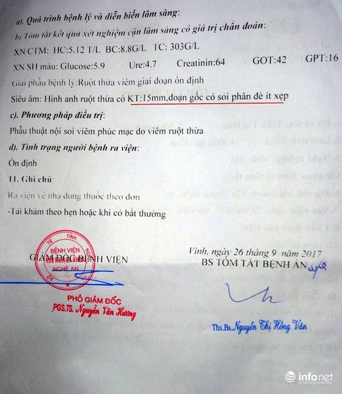 Còn theo bản tóm tắt bệnh án của chị Trần Thị Hoa tại BVHNĐK Nghệ An ngày 26/9/2017 cho thấy, bệnh nhân vào viện ngày 28/8/2017, chẩn đoán bị Viêm ruột thừa, hình ảnh siêu âm ruột thừa có kích thước 15 mm, đoạn gốc có sỏi phân đè ít xẹp, ra viện ngày 5/9/2017 trong tình trạng sức khỏe ổn định.