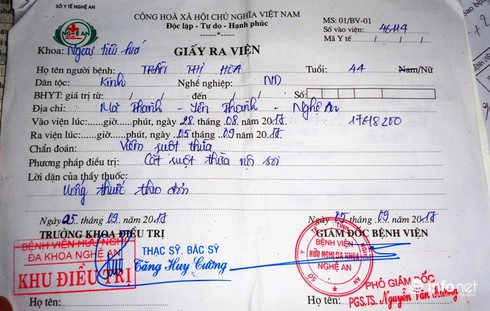 Giấy chứng nhận phẩu thuật và Giấy ra viện của chị Hoa tại BVHNĐK Nghệ An |