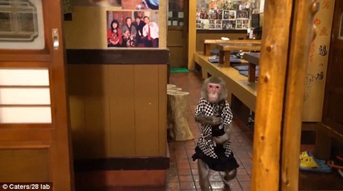 Một đoạn video về quán ăn cho thấy chú khỉ 17 tuổi Fuku-chan, trong trang phục váy ngắn và áo đồng phục bồi bàn giao bia và đưa khăn cho khách hàng rất chuyên nghiệp.