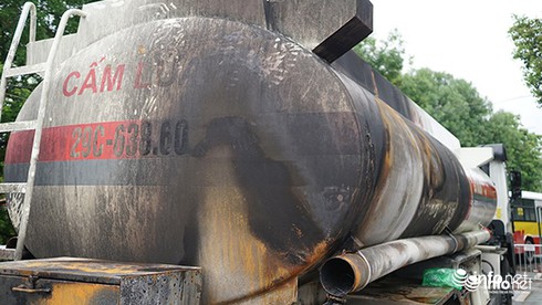 Chiếc xe bồn đã bị cháy rụi bên ngoài nhưng hơn 20 khối xăng bên trong vẫn được cứu. (Vụ cháy cây xăng Đền Lừ chiều ngày 5/7/2016). |