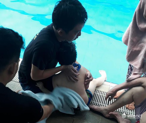 Thiếu táKhúc Nguyên Khánh sơ cứu cho cháu bé bị đuối nước tại bể bơi Olympia Nam Đô ngày 6/5. |
