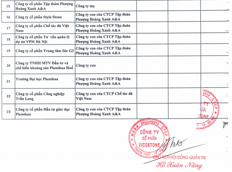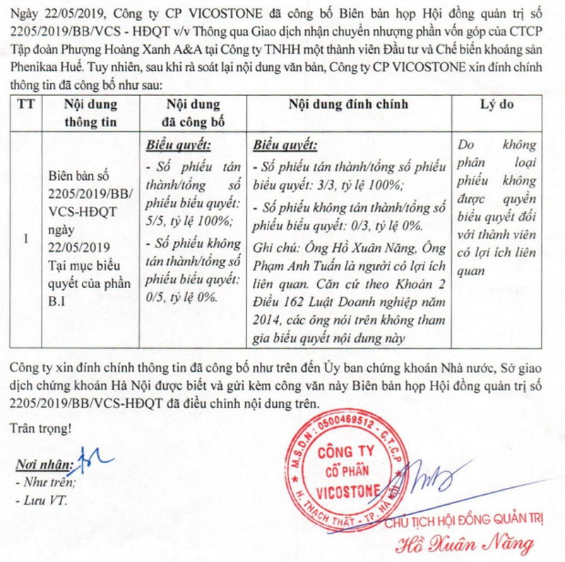 CTCP Vicostone vừa gửi văn bản đến UBCK, Sở GDCK TP. HCM đính chính nội dung Biên bản họp HĐQT số 2205/2019/NN/VCS–HĐQT ngày 22/05/2019 về việc thông qua giao dịch nhận chuyển nhượng phần vốn góp của CTCP Tập đoàn Phượng Hoàng Xanh A&A tại Công ty TNHH MTV Đầu tư và Chế biến khoáng sản Phenika Huế.