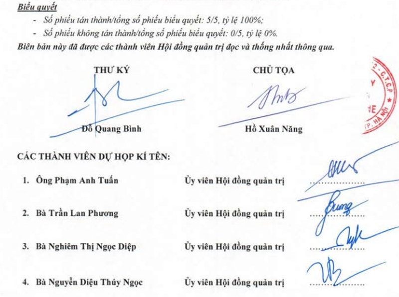 Kết quả biểu quyết (5/5 thành viên) và chữ ký những người tham gia cuộc họp HĐQT ngày 22/5/2019. |