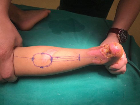Tại Trung tâm Sản Nhi, qua thực hiện khám lâm sàng và tổng hợp các kết quả xét nghiệm, chiếu chụp, các bác sỹ đánh giá vết thương khuyết hổng vùng gót chân của bệnh nhi khá nghiêm trọng, đã lộ gân và xuất hiện tình trạng viêm, chảy dịch. Sau khi hội chẩn, các bác sỹ quyết định phẫu thuật che phủ vết thương bằng phương pháp chuyển vạt da cuống mạch liền.