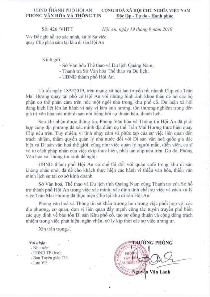Ngay sáng ngày 19/9, phòng Văn hóa và Thông tin của UBND thành phố Hội An đã có văn bản đề nghị hỗ trợ xác minh, xử lý sự việc quay clip phản cảm tại khu di sản Hội An của Trần Mai Hương.