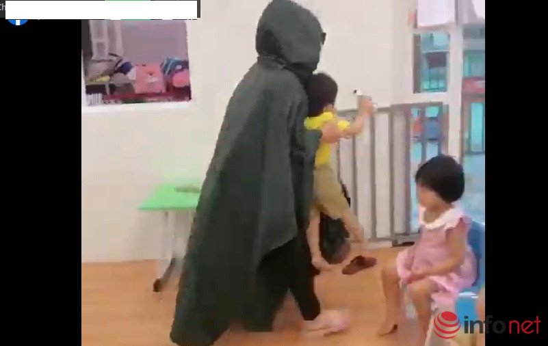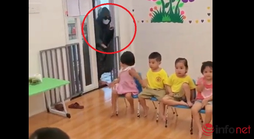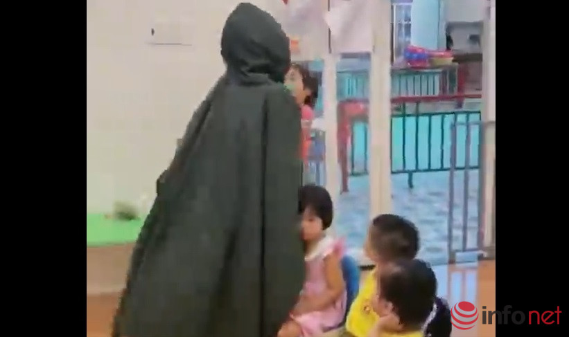 Theo nội dung đoạn clip, khi các em nhỏ đang ngồi quây quần trong lớp thì một cô giáo “ngụy trang” thành người lạ mặc áo mưa, đeo khẩu trang, kính râm, mang theo túi quà... nhanh chóng tiến đến phía các em.