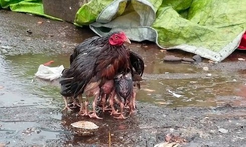 Gà mẹ đội mưa xòe cánh che cho đàn con |