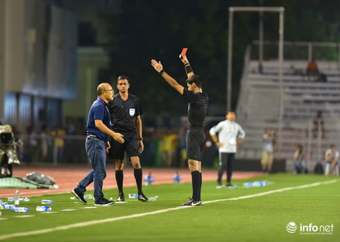 Sự phản ứng gay gắt của ông thầy người Hàn buộc trọng tài chính phải can thiệp. Không ngần ngại, trọng tài chính đã rút thẻ đỏ trực tiếp và truất quyền chỉ đạo của HLV Park Hang Seo.