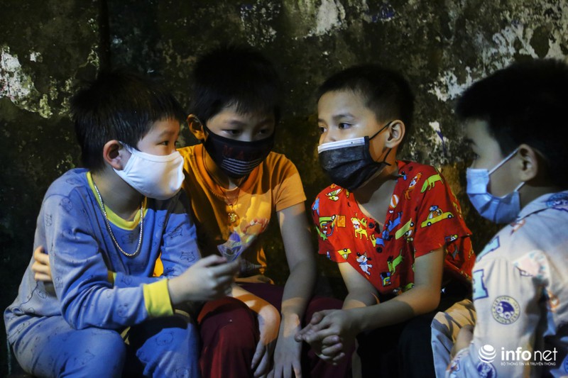Cháu Nguyễn Đức Hiếu (áo màu cam) ngồi chơi cùng các bạn trước cửa nhà mình cho biết: “Cháu cảm thấy rất thoải mái và an toàn trong những ngày vừa qua, mỗi ngày đều được sự quan tâm của mọi người, nhất là các cô chú y tá tại đây”.