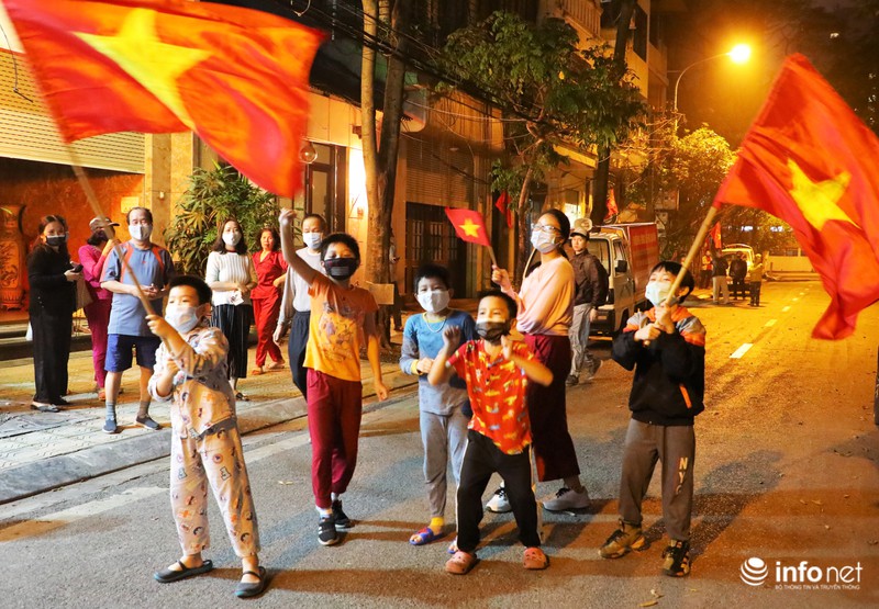 Trẻ em cầm cờ Tổ quốc chạy khắp con phố đã được gỡ hàng rào phong tỏa.