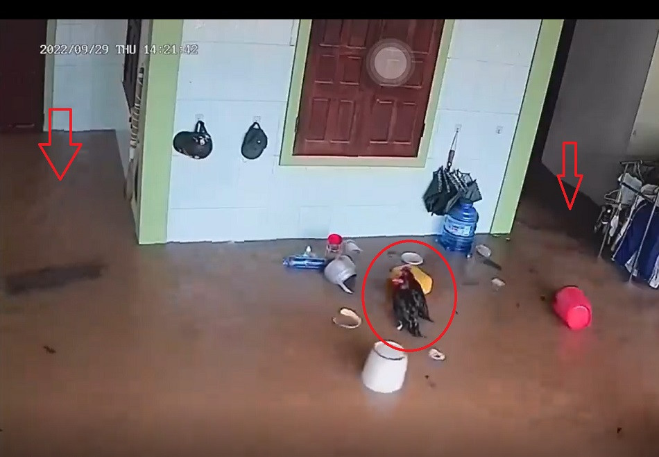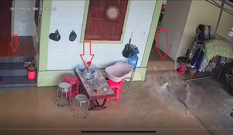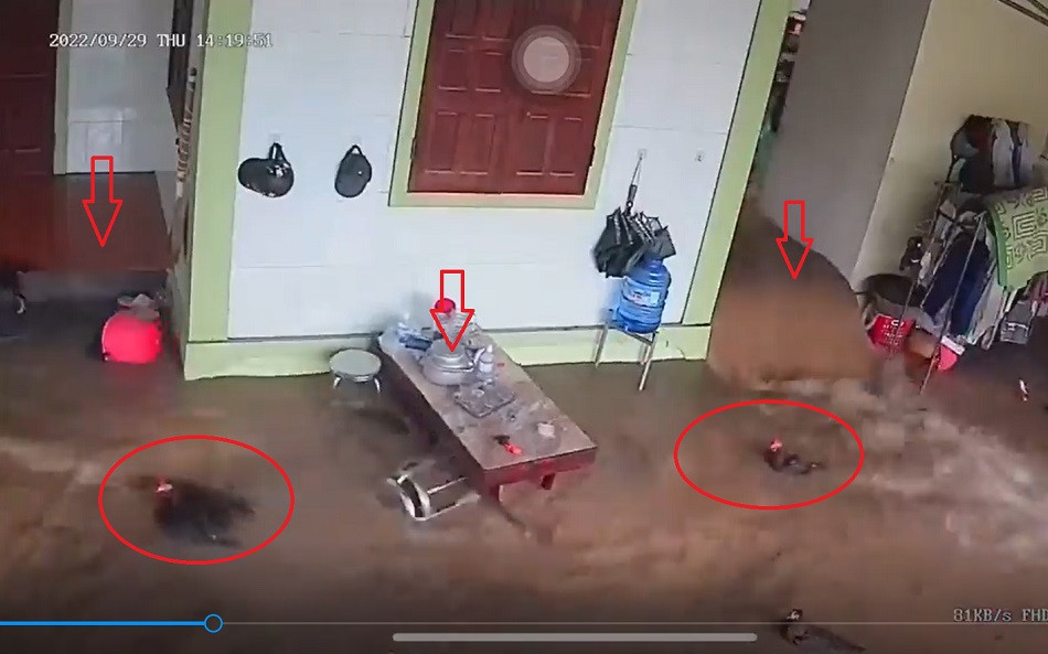 Theo clip, theo giờ camera vào lúc 14h19'16" ngày 29/9/2022 ở sân nhà đang có bộ bàn nghế và nhiều đồ dùng của gia đình. Dòng nước lũ đục ngầu bắt đầu tràn từ phía sau nhà qua khu bếp ra sân, nước cuồn cuộn chảy ào tới quanh nhà. Rất nhanh, nước lũ kéo về cuốn trôi những vật dụng hàng ngày như xô, chậu, thùng nước... từ nhà ra sân. Cả đàn gà không kịp chạy lũ cũng bị nước cuốn trôi. Chỉ có 2 con gà may mắn vướng vào bộ bàn ghế ở sân nên được chủ nhà nhấc lên bàn đứng. Chỉ trong vòng chưa đầy 3 phút từ khi lũ ào tới, thời điểm 14h21'44", nước lũ đã dâng cao tới nửa mét, ngập hết bộ bàn ghế để ở sân cũng như ngập qua bậc tam cấp tràn vào nhà.