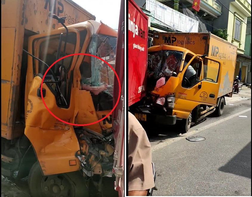 Hậu quả vụ tai nạn khiến 2 xe bị hư hỏng nặng, người phụ nữ ngồi ghế phụ của xe tải màu vàng đã bị thương nặng, chân mắc kẹt vào phần trên kính lái xe ô tô.