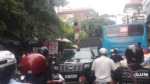 Vào thời điểm mà con phố có nhiều phương tiện và người lưu thông, bỗng phát hiện một cô gái leo đỉnh chiếc xe ô tô 7 chỗ màu đen hiệu Ford mang BKS: 30E.XXX đang dừng giữa lòng đường la hét, múa may với biểu hiện nghi bị ngáo đá.