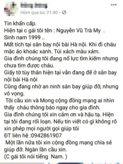 Theo bà Đông, hiện bà đã nhờ người thân báo tin đến Đồn Công an sân bay Nội Bài để nhờ hộ trợ. Đồng thời, bà Đông và người thân cũng đăng tin lên mạng xã hội Facebook, nhờ cộng đồng mạng hỗ trợ, tìm kiếm tung tích con gái.