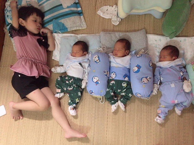 "Em sinh 3 nên tình thương cũng phải san sẻ. Nếu có một con thì mẹ sẽ ẵm bồng được nhiều hơn. Nhà em thì đặt các bé nằm suốt. Mà dạo này 3 đứa lớn rồi nên toàn đòi bế. Có khi em ôm 2 tay 2 đứa, đứa kia không làm sao bế được. Nếu được bà bế giúp thì 4 mẹ con ra võng nằm, không thì cũng phải kệ, thằng nào không khóc thì em lại đặt xuống", 9x kể.