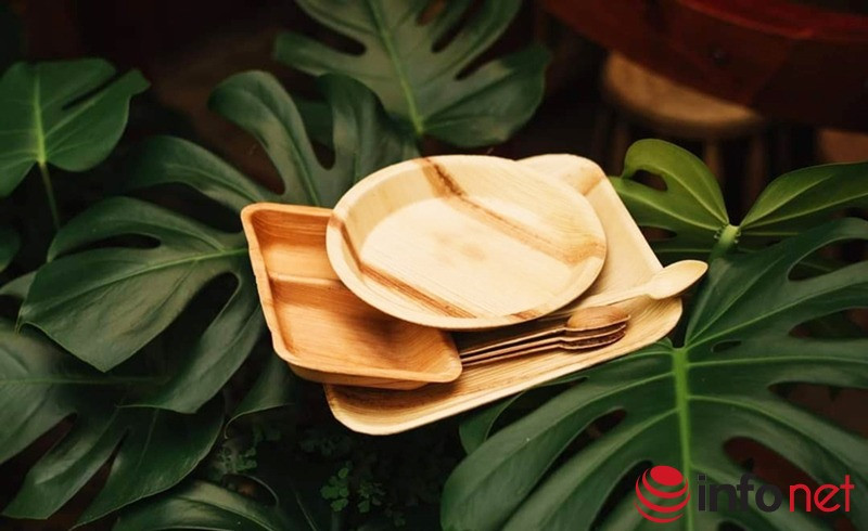 Cô gái trẻ làm khay, chén, thìa từ mo cau thân thuộc thay đồ nhựa dùng một lần