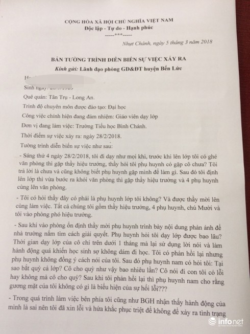 Cô B.T.C.N, giáo viên lớp 4/3 Trường Tiểu học Bình Chánh (Bến Lức, Long An) cho biết, sáng ngày 28/2, khi cô chuẩn bị lên lớp thì được hiệu trưởng mời vào văn phòng làm việc với 4 phụ huynh. Một phụ huynh nam liên tục hỏi: “Tại sao bắt quỳ cả lớp? Cô cho quỳ như vậy bao nhiêu lần? Cô nói đi con tôi có lỗi hay không mà cô cho quỳ?”.