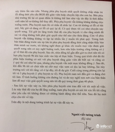Tuy nhiên, nhà trường không chấp nhận yêu cầu này vì đây là thời điểm cuối năm học, hồ sơ không thể thay đổi. Phía phụ huynh vẫn khăng khăng không chịu xuống nước, nhắc đi nhắc lại: “Con tôi không có lỗi cô bắt quỳ, bây giờ cô đang có lỗi cô quỳ lại đi. Cô quỳ được tôi coi như chuyện này giải quyết xong”.