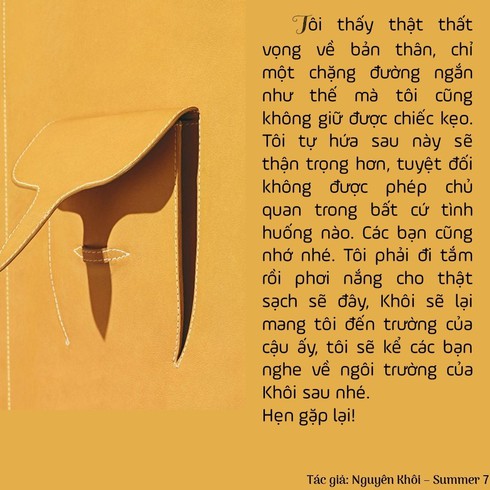 Mặc dù câu văn vẫn còn non nớt, nhưng câu chuyện dưới góc nhìn trong sáng, dễ thương của cậu bé Nguyên Khôi (năm nay lên lớp 4) khiến người đọc thích thú. Câu chuyện về một chiếc túi áo, không may làm rơi chiếc kẹo mà Khôi được mẹ thưởng sau ngày đầu tiên đến trường. Chiếc túi áo rất ăn năn vì lỗi lầm của mình. Bên cạnh đó, tác giả Nguyên Khôi cũng không quên lồng ghép bài học ý nghĩa trong tác phẩm.