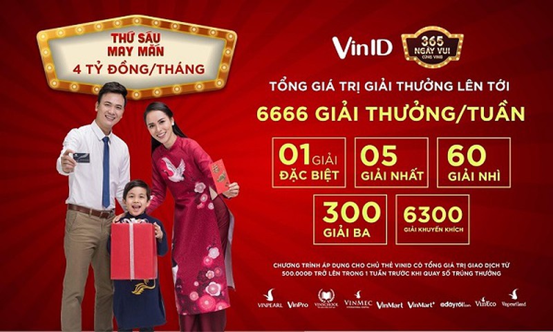| “365 ngày vui” là chương trình khuyến mãi áp dụng cho các chủ thẻ VinID. Theo đó, mỗi tháng VinID sẽ dành hơn 4 tỷ đồng khuyến mại trực tiếp vào các sản phẩm dịch vụ trong hệ sinh thái của tập đoàn dành cho tất cả các khách hàng sở hữu thẻ VinID. Ngoài ra, VinID còn dành 4 tỷ đồng cho các chương trình bốc thăm với hàng ngàn giải thưởng giá trị dành cho các chủ thẻ có phát sinh giao dịch mua sắm trong tuần với tổng hóa đơn trị giá từ 500.000 đồng/ tuần trở lên. Mã số tham gia dự thưởng chính là 16 số ghi trên thẻ VinID.Các chương trình khuyến mãi và bốc thăm được thiết kế linh hoạt công bố vào cuối mỗi tháng trước đó nhằm mang lại nhiều niềm vui và bất ngờ dành cho các khách hàng thân thiết. |