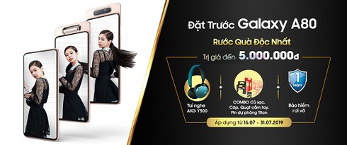Nhanh nhạy với thị trường, MobiFone đem đến cơ hội sở hữu siêu phẩm sớm cho người dùng Việt cùng gói quà tặng cực giá trị. Theo đó, từ ngày 16/7 đến ngày 31/7/2019 khi đến các cửa hàng MobiFone đặt mua trước Galaxy A80, khách hàng sẽ được nhận bộ quà tặng trị giá lên đến 5 triệu đồng gồm: Tai nghe không dây AKG Y500; combo Củ sạc, Cáp, Quạt cầm tay, Pin dự phòng Titan; 1 năm bảo hiểm rơi vỡ.