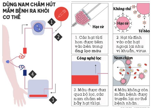 Trong nghiên cứu mới công bố của mình, tiến sĩ George Frodsham đã đưa ra ý tưởng đính các hạt nano từ tính vào mầm bệnh. Nhờ vậy, anh có thể sử dụng một hệ nam châm trong máy lọc máu để hút các mầm bệnh này và hạt từ tính ra ngoài, trả lại các tế bào máu khỏe mạnh cho người bệnh.