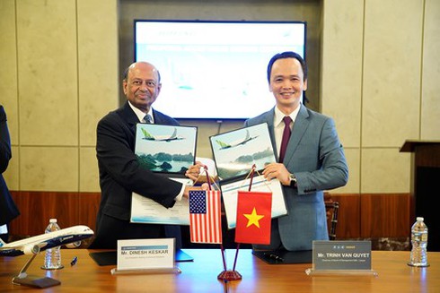 Chủ tịch Tập đoàn FLC Trịnh Văn Quyết và Phó Chủ tịch phụ trách kinh doanh khu vực châu Á – Thái Bình Dương và Ấn Độ của Boeing Dinesh Keskar thực hiện lễ ký kết. |