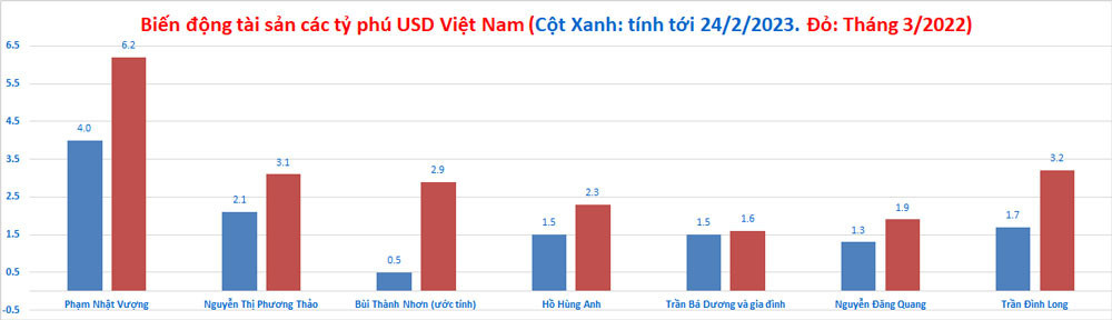 Thống kê cho thấy, tính đến ngày 24/2, cả 6 tỷ phú USD Việt và ông Bùi Thành Nhơn có tổng tài sản khoảng 12,6 tỷ USD, thấp hơn mức 14,3 tỷ USD (phiên 27/1 ngay sau Tết Nguyên đán) và thấp hơn nhiều so với mức 21,2 tỷ USD ghi nhận trong bảng xếp hạng hồi tháng 3/2022.
