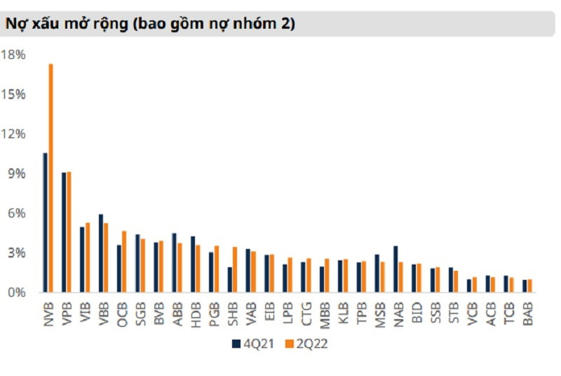 Theo CTCK Mirae Asset, về chất lượng tài sản của hệ thống ngân hàng, có 2 điểm nổi bật là: Thứ nhất, số dư nợ tái cơ cấu vào thời điểm cuối quý 2/2022 vẫn còn khá lớn, dù nợ tái cơ cấu đã giảm đáng kể trong giai đoạn nửa đầu năm 2022. Và điểm đáng lưu ý là nợ tái cơ cấu của các ngân hàng có tỷ trọng bán lẻ cao hơn hẳn so với các ngân hàng có tỷ trọng cho vay doanh nghiệp hay đầu tư trái phiếu cao.