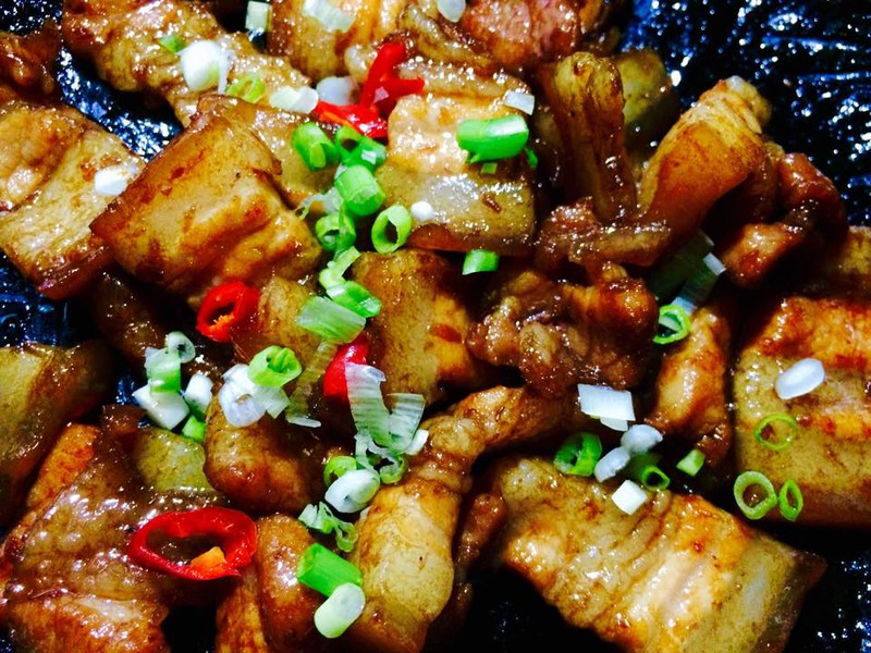 Bước 4: Rang thịt cho đến khi cạn khô nước và hơi chảy mỡ, vàng xém là được. Lúc này nếu ăn được cay thì các bạn cho vào chảo thịt vài lát ớt tươi, rắc thêm hành hoa thái nhỏ đảo đều cho chín tái thì tắt bếp.