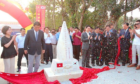 Lãnh đạo TP Namyạnju (Hàn Quốc) và tỉnh Nghệ An tham gia buổi lễ gắn biển công trình (Ảnh. N.D) |