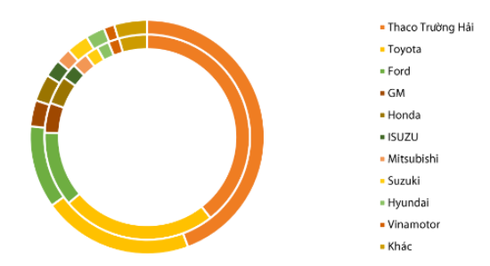 Thị phần của các DN ôtô tại Việt Nam (Vòng trong: 6 tháng/2017; Vòng ngoài: 6 tháng/2016). Nguồn: VAMA, VDSC, |