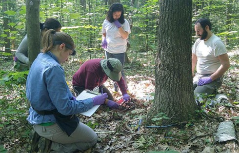 Nhà sinh học Frederik Schulz (người áo đỏ) đang trích lấy mẫu trong rừng Harvard. |