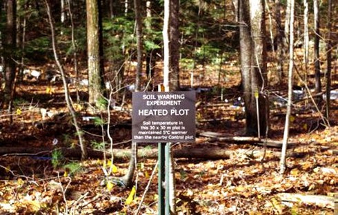 Một bảng thông báo trong rừng Harvard cho biết về tình trạng nóng lên toàn cầu và tác động của nó đối với sự đa dạng vi sinh vật trong đất. (ảnh Jeff Blanchard). |