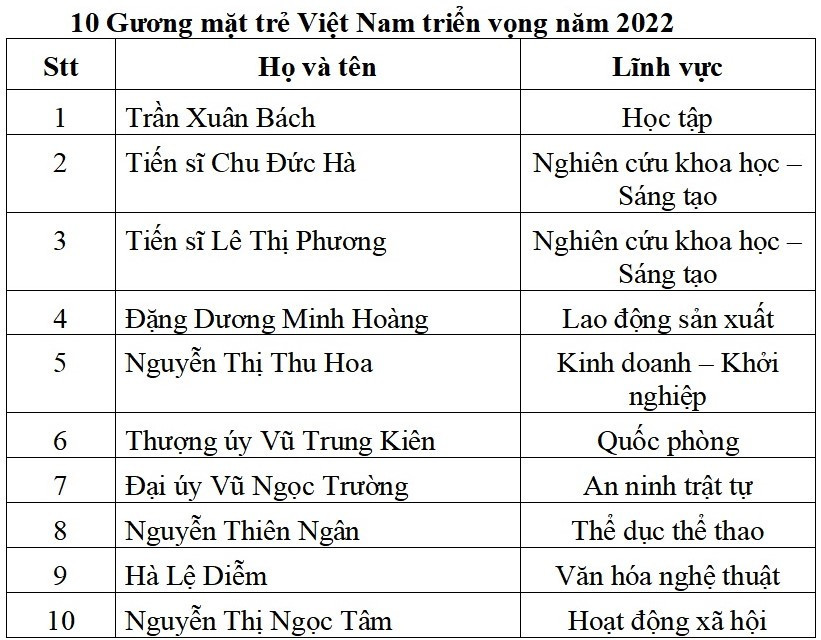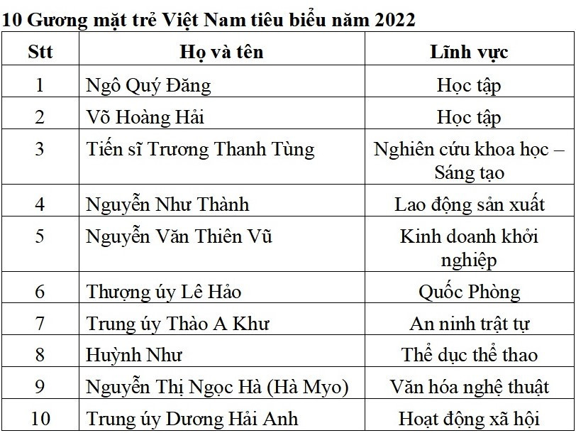 Cụ thể, danh sách 10 Gương mặt trẻ Việt Nam tiêu biểu năm 2022 như sau: