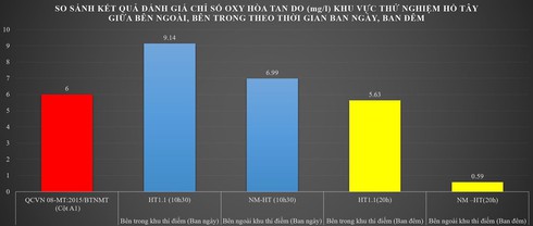 Kết quả đánh giá chỉ số oxy hòa tan do (mg/l) khu vực thử nghiệm Hồ Tây giữa bên ngoài, bên trong theo thời gian ban ngày, ban đêm. |