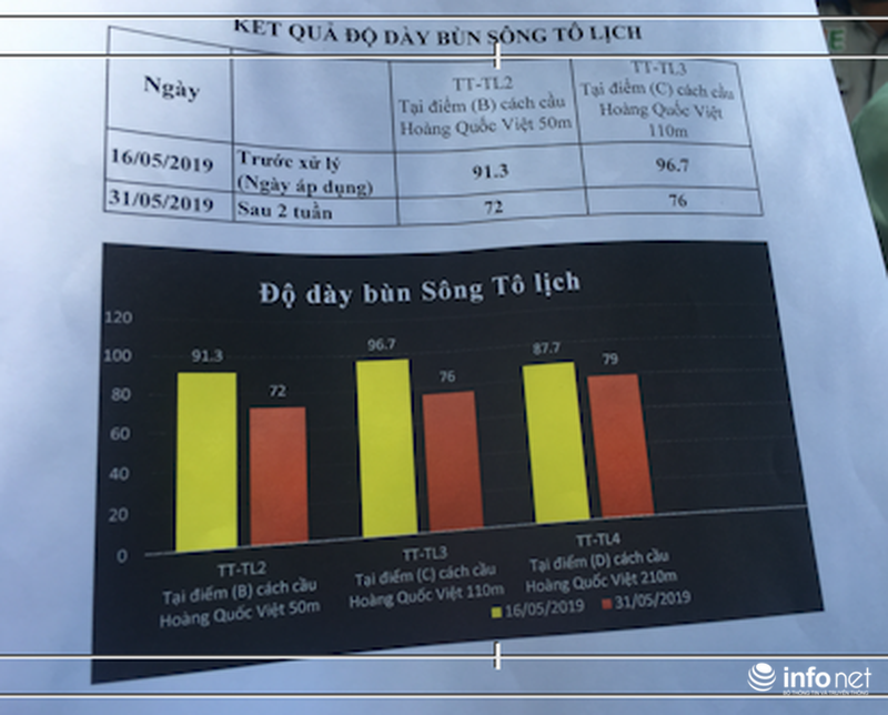Cụ thể, tại điểm B cách cầu Hoàng Quốc Việt 50 m, độ dày bùn giảm từ 91,3 cm xuống 72 cm. Tại điểm C cách 110 m, độ dày giảm từ 96,7 cm xuống còn 76 cm. Tại điểm D cách 210 m, độ dày bùn giảm từ 87,7 cm xuống còn 79 cm.