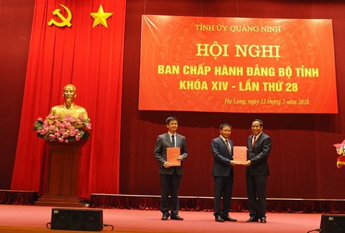 Đồng chí Nguyễn Thanh Bình trao các quyết định của Bộ Chính trị về công tác cán bộ cho các đồng chí Lê Quang Tùng và Nguyễn Văn Thắng. Ảnh báo Quảng Ninh |