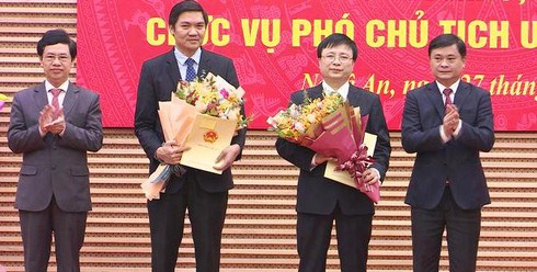 Lãnh đạo tỉnh Nghệ An trao Quyết định và tặng hoa chúc mừng ông Hoàng Nghĩa Hiếu và ông Bùi Đình Long. (Ảnh: NTV) |